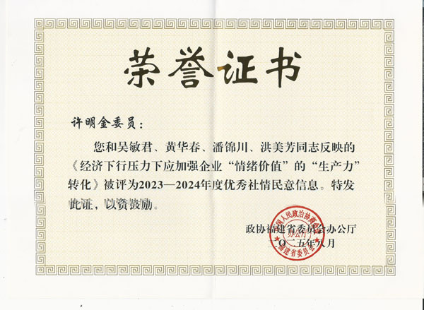 近日,集團(tuán)董事局主席許明金先生,和吳敏君、黃華春、潘錦川、洪美芳提交的政協(xié)提案《經(jīng)濟(jì)下行壓力下應(yīng)加強(qiáng)企業(yè)“情緒價(jià)值”的“生產(chǎn)力”轉(zhuǎn)化》,榮獲福建省政協(xié)頒發(fā)的2023-2024年度“優(yōu)秀社情民意信息”榮譽(yù)證書。